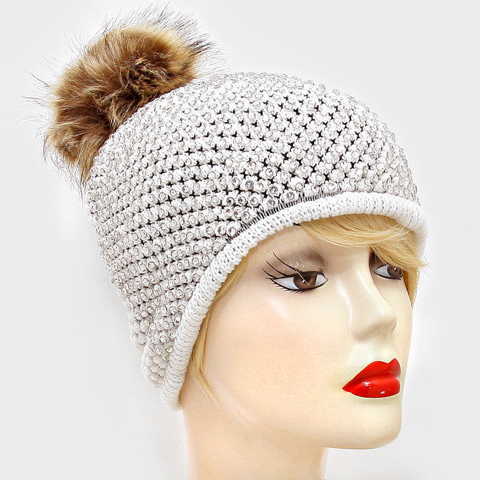 HATEGORY Crystal Studded Knit Beanie Hat with Pom Pom Fur