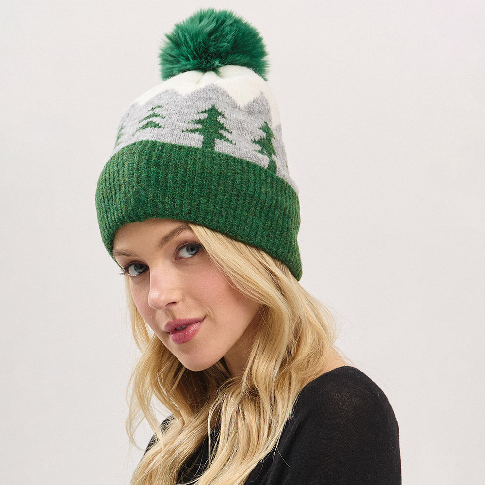 Stay cozy and stylish with this winter pom-pom beanie featuring a charming mountain and tree pattern. With its snug fit and soft texture, it's perfect for chilly days, outdoor adventures, or holiday looks. A playful yet practical accessory for cold-weather comfort and seasonal flair.