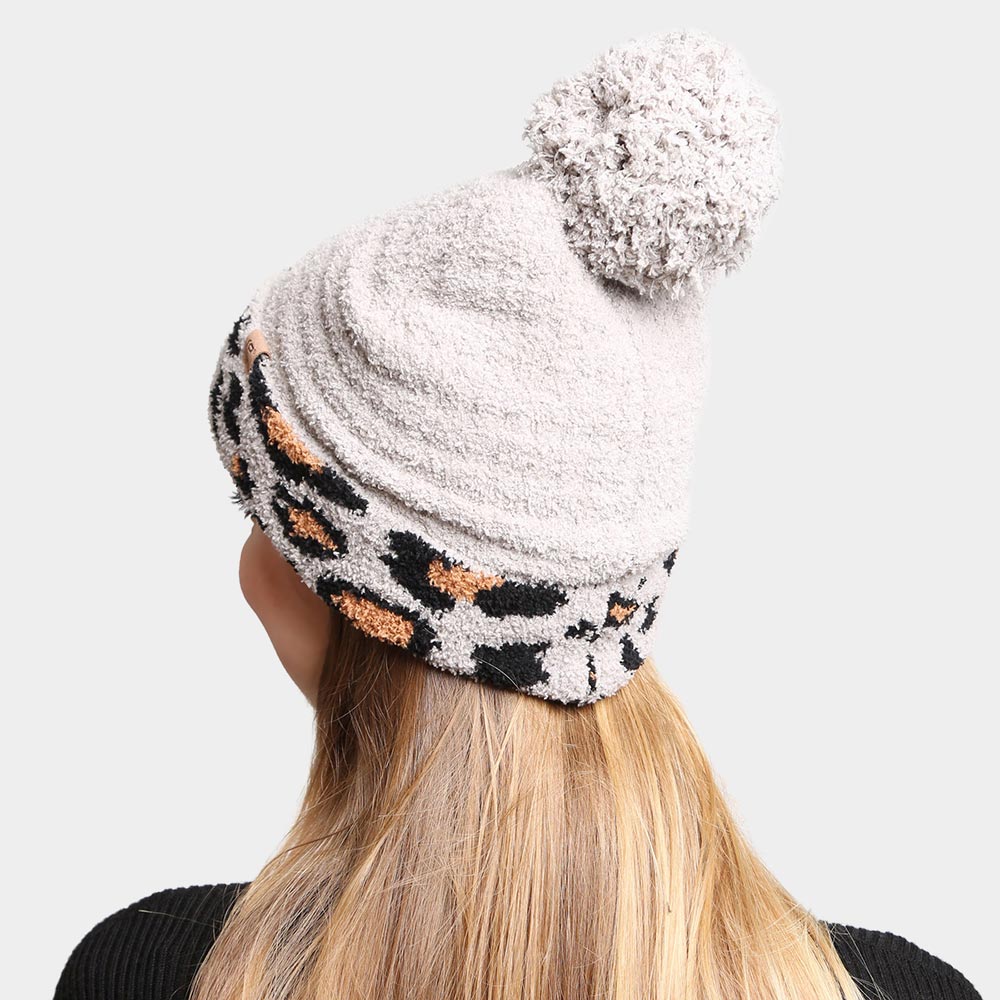 HATEGORY Solid Color Linked Leopard Accented Pom-Pom Beanie
