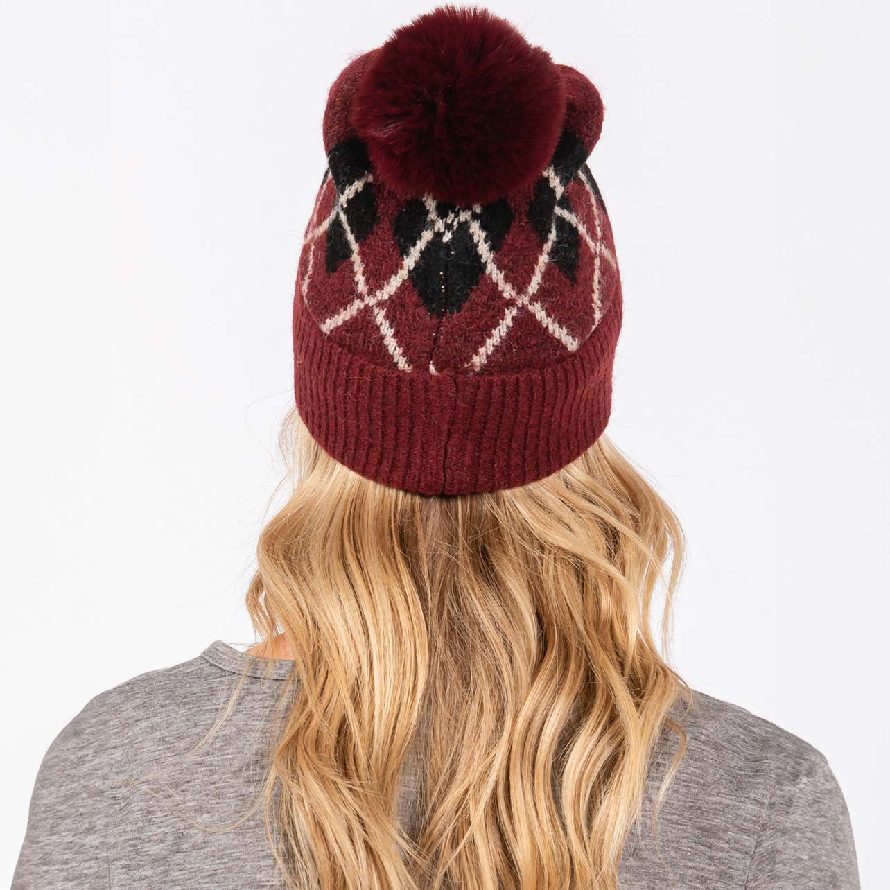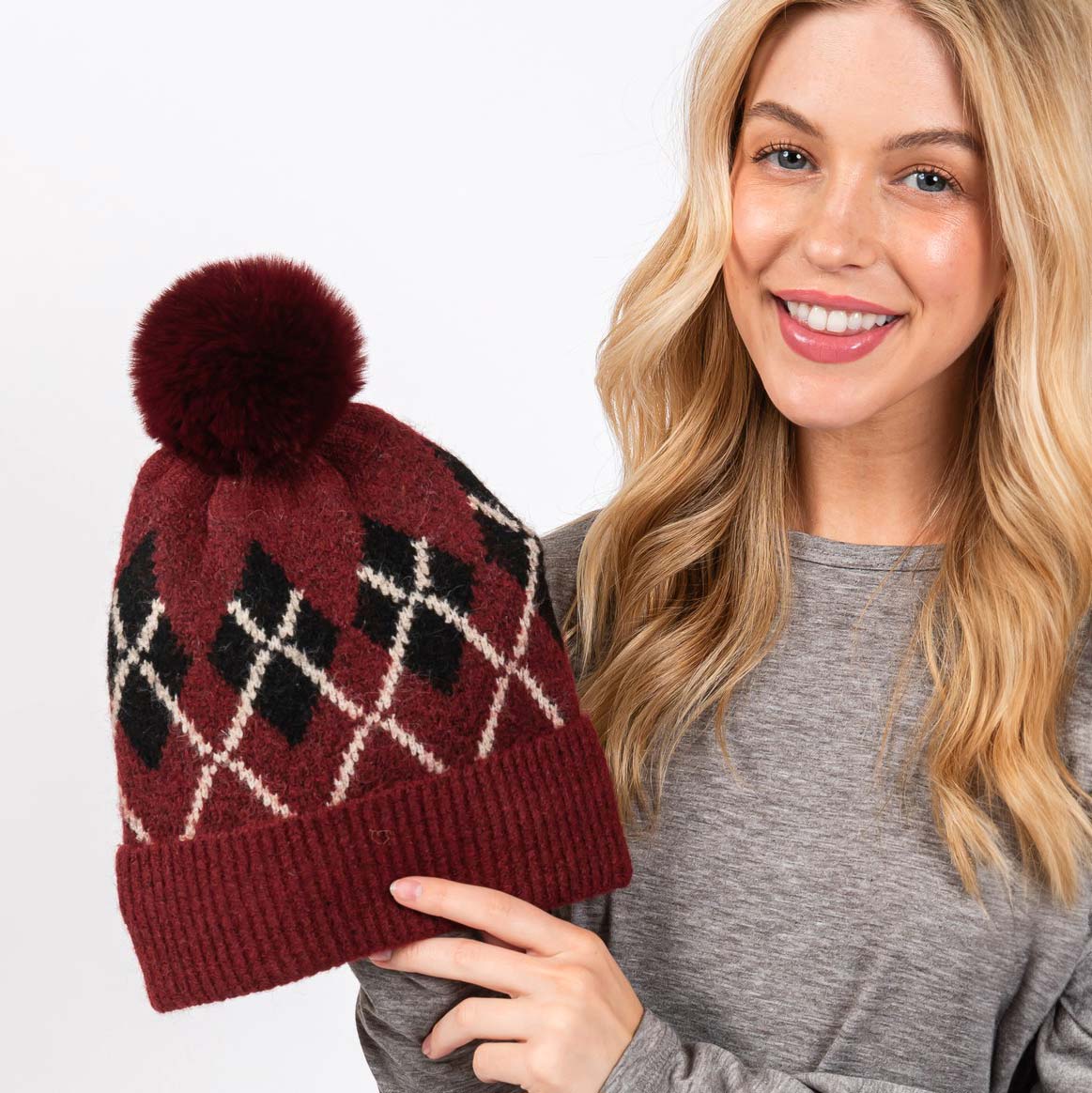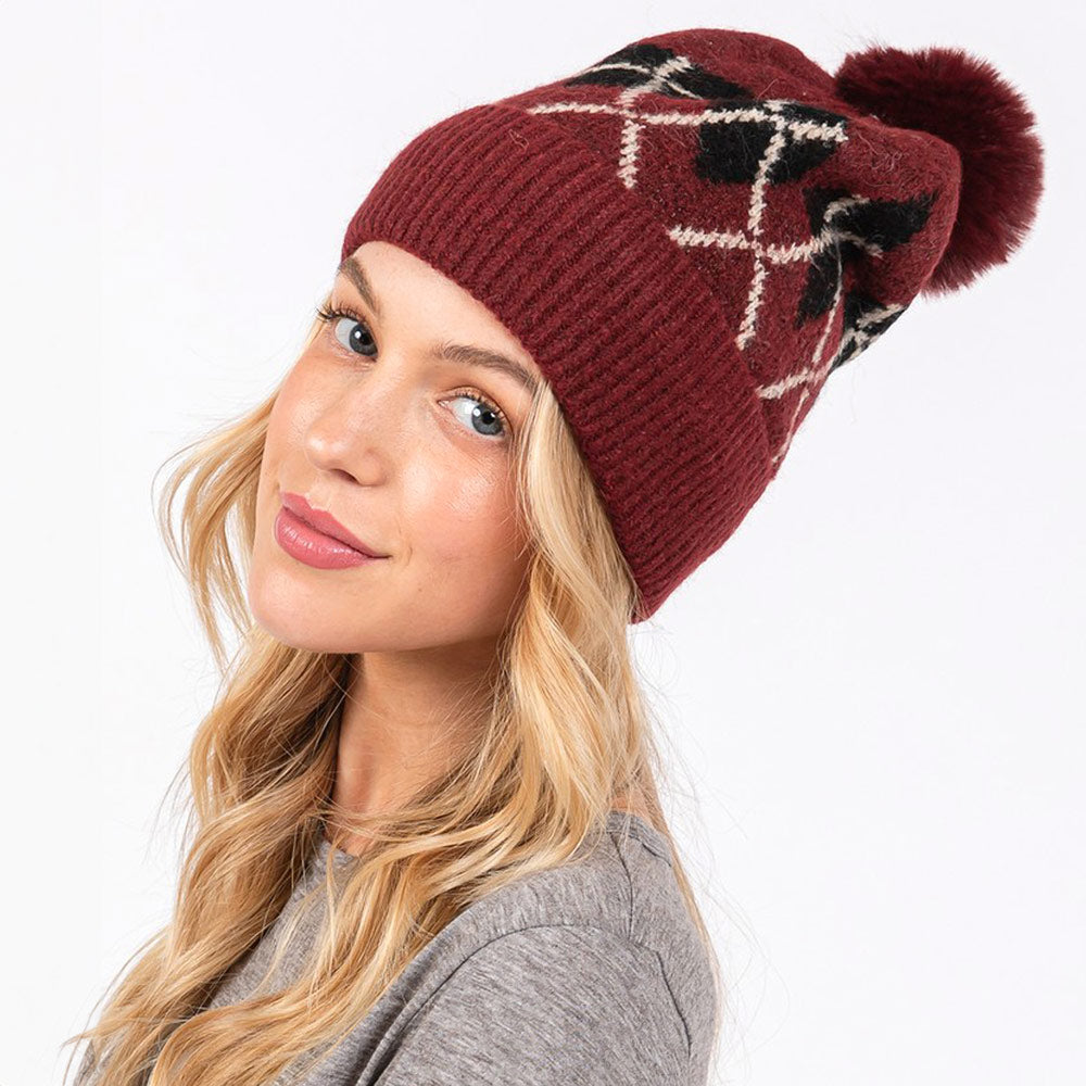 HATEGORY Wool Blended Argyle Fleece Pom Pom Beanie Hat